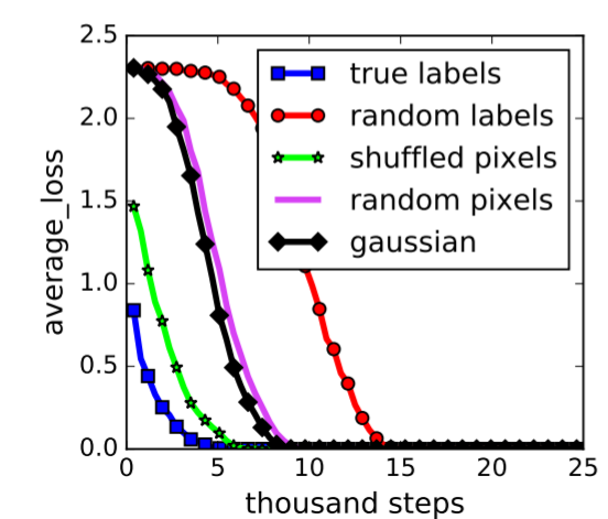 更加令人惊讶的是,我们即使给数据一个随机的标签,它也可以完美拟合(请见下图红色曲线),最后得出拟合误差为0。如果按照标准理论来说,这意味着这个模型没有任何偏差(bias),能帮我们解释任何结果。请想想看,任何东西都能解释的模型,真的可靠吗,包治百病的良药可信吗?